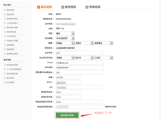 第二步:点击左侧“填写报考资料”,填写并确认个人基本信息。