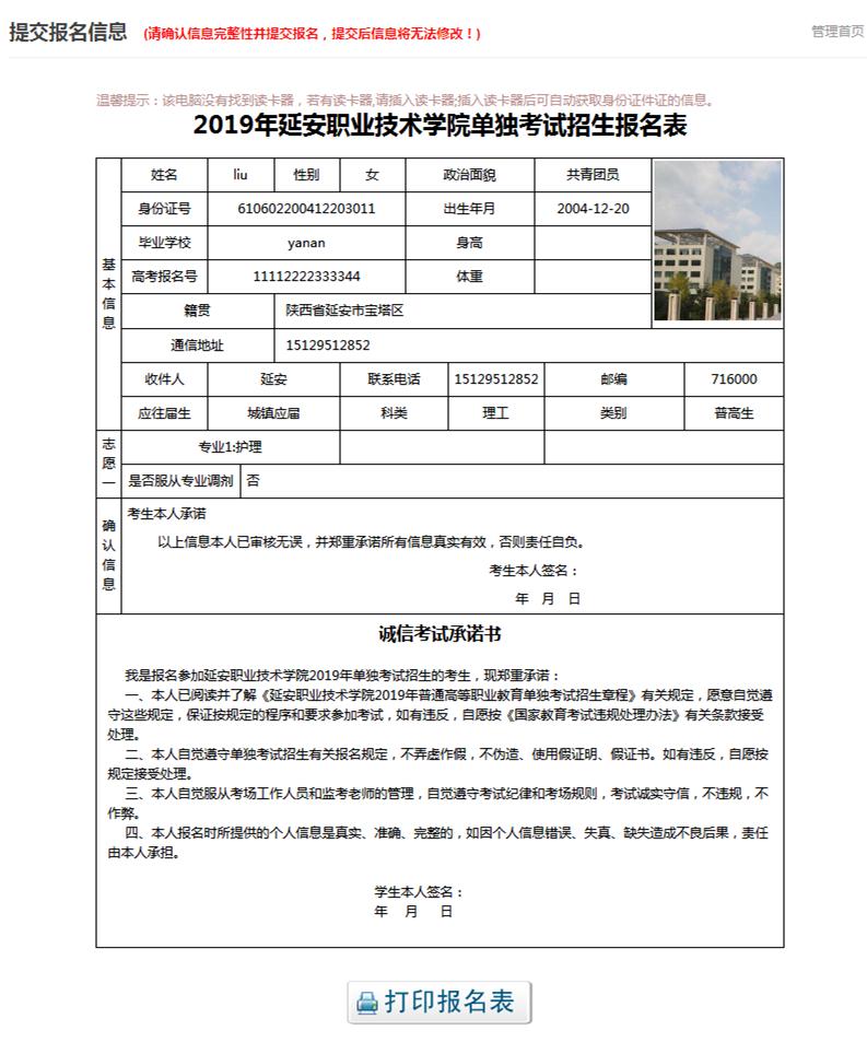 第五步:仔细核对报名表信息、提交报名表并打印(提交之后报名信息将不得修改)。