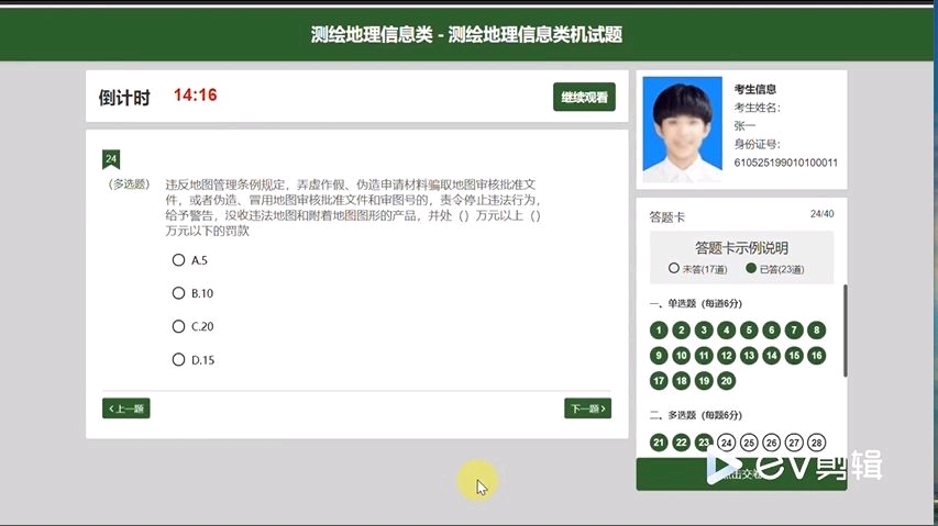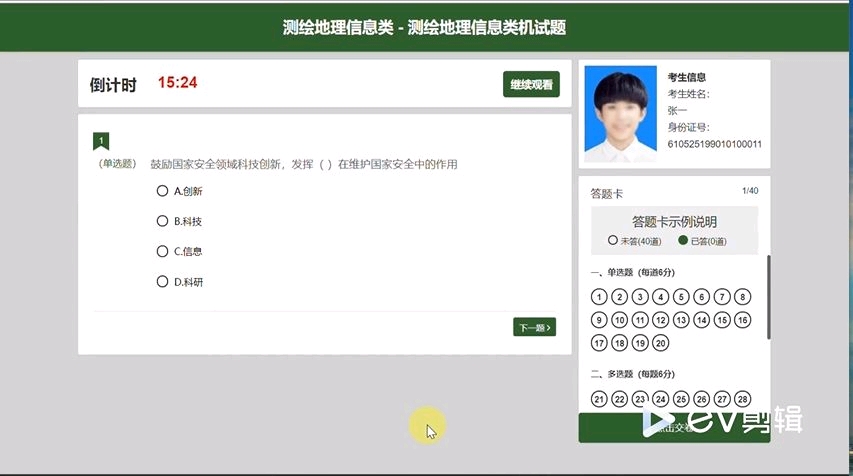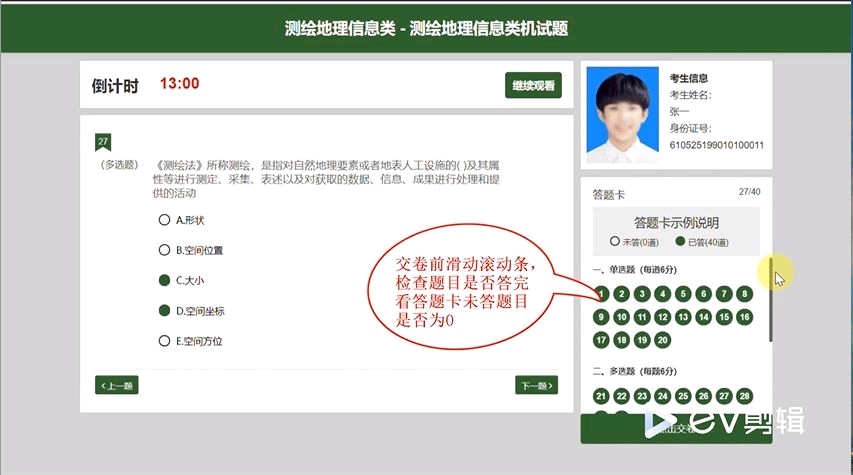 no.9 考试页面设置着考试倒计时提醒页面,答题页面右侧显示绿色圆圈为已答,白色圆圈为未答