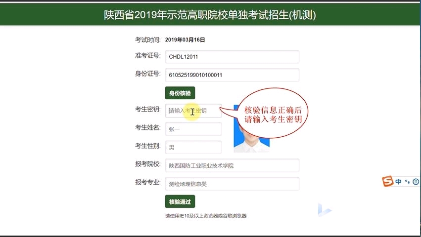 no.3 核验后输入考生密钥,并点击核验通过进入试卷说明界面