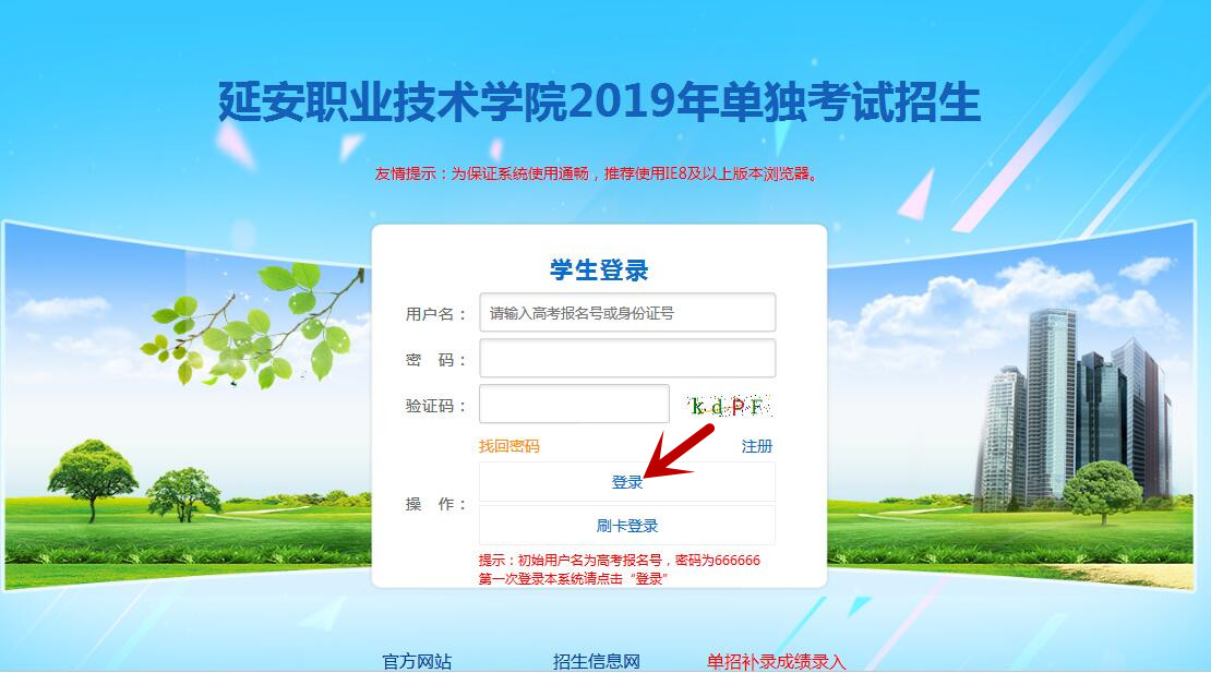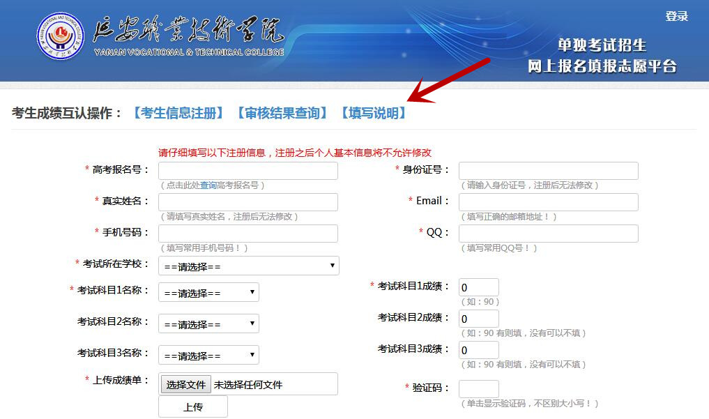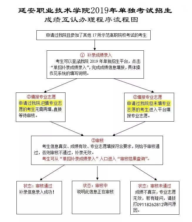 已经申请过我院的考生,需登录考试院校网站查询成绩,将成绩页面截图保存并上传至我院单招平台系统(上传操作:在学院网站“延安职业技术学院2019年单独考试招生平台”页面下方点击“单招补录成绩录入”按钮,页面打开后录入考生成绩等信息、上传成绩截图文件,并点击“保存并提交”按钮)。具体流程如下:
