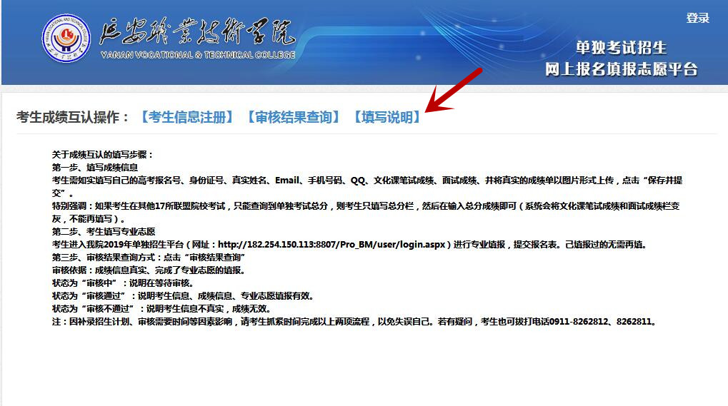 已经申请过我院的考生,补录成绩录入完成后,再进入“延安职业技术学院2019年单独考试招生平台”系统,按照系统提示:修改密码、填写考生基本信息、填报专业志愿,并点击“保存提交”按钮(提示:考生要记住修改的新密码,以便后期登录该平台查询预录取结果)。