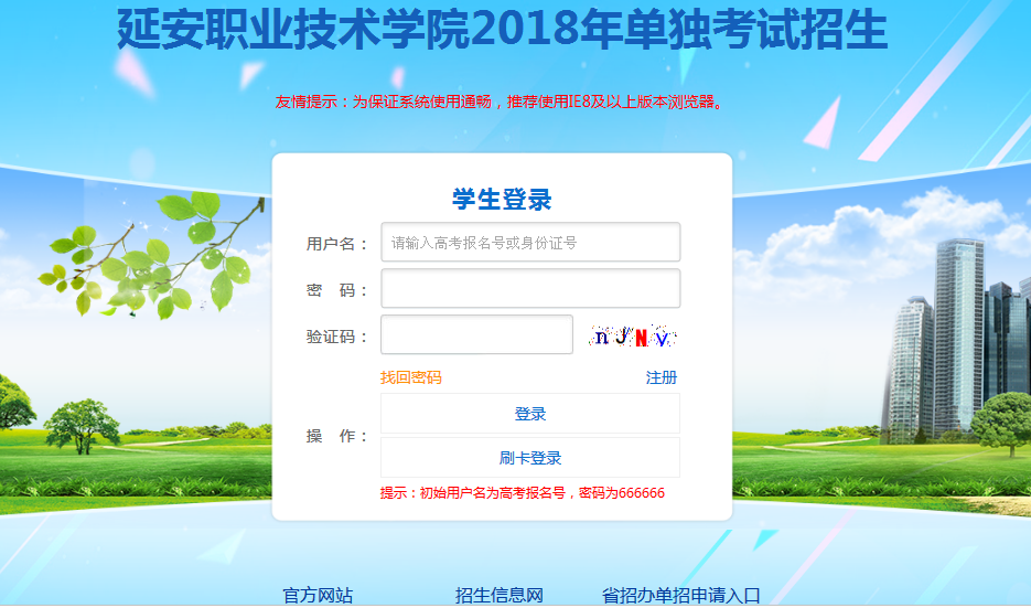 第一步:考生必须于3月8日至3月16日登录我校招生信息网(网址:http://www.yapt.cn),进入单独考试招生网上管理平台。考生无需注册,直接登录。