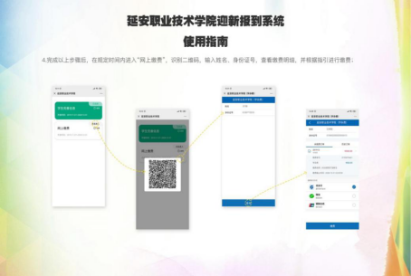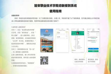 我校在 “延安职业技术学院”微信公众号上为新生提供网上报到注册服务。不接受现场报到,具体到校时间另行通知。具体流程如下: